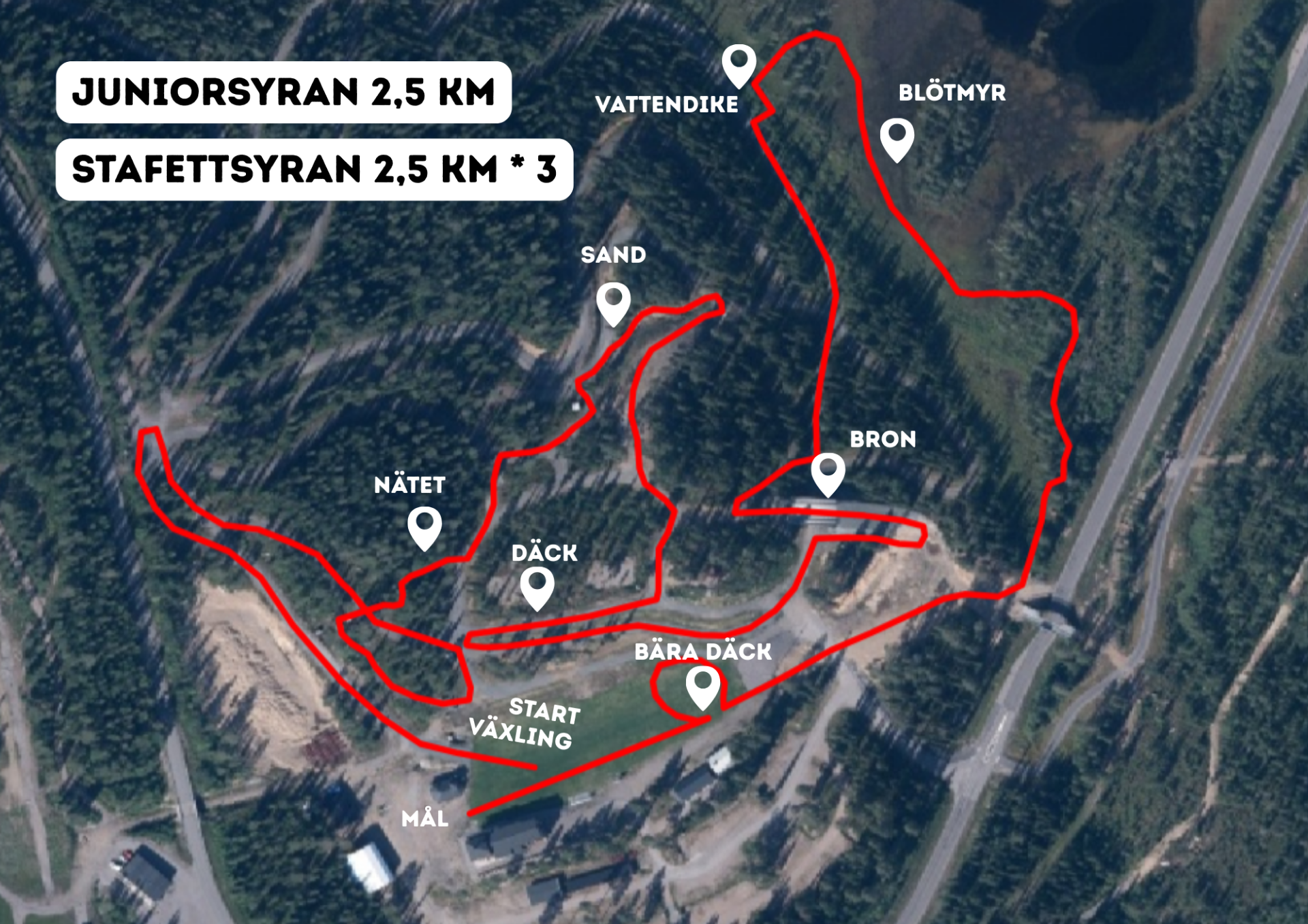 Juniorsyran 2,5 km och Stafettsyran 2,5 km har samma bansträckning med både naturliga och uppbyggda hinder – som att krypa under nät, ta sig över däckhinder, bära däck samt springa genom sand och blöt myr. En kort men riktigt tung och utmanande upplevelse! Växlingen i på stafettsyran sker innanför vaxlingszonen på Hellnerstadion genom att räcka över lagvästen.
